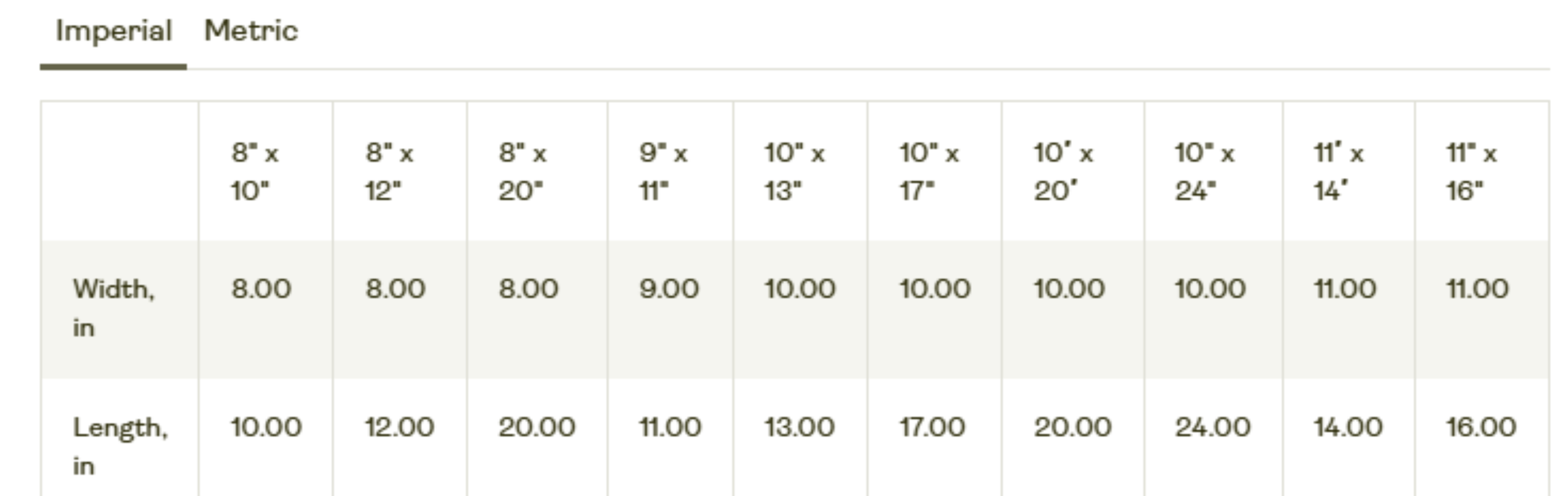 8" x 10" 12" x 16" 16″ x 20″ 18″ x 24″ 24″ x 36″ 10″ x 10″ 16″ x 16″ 18" x 18"