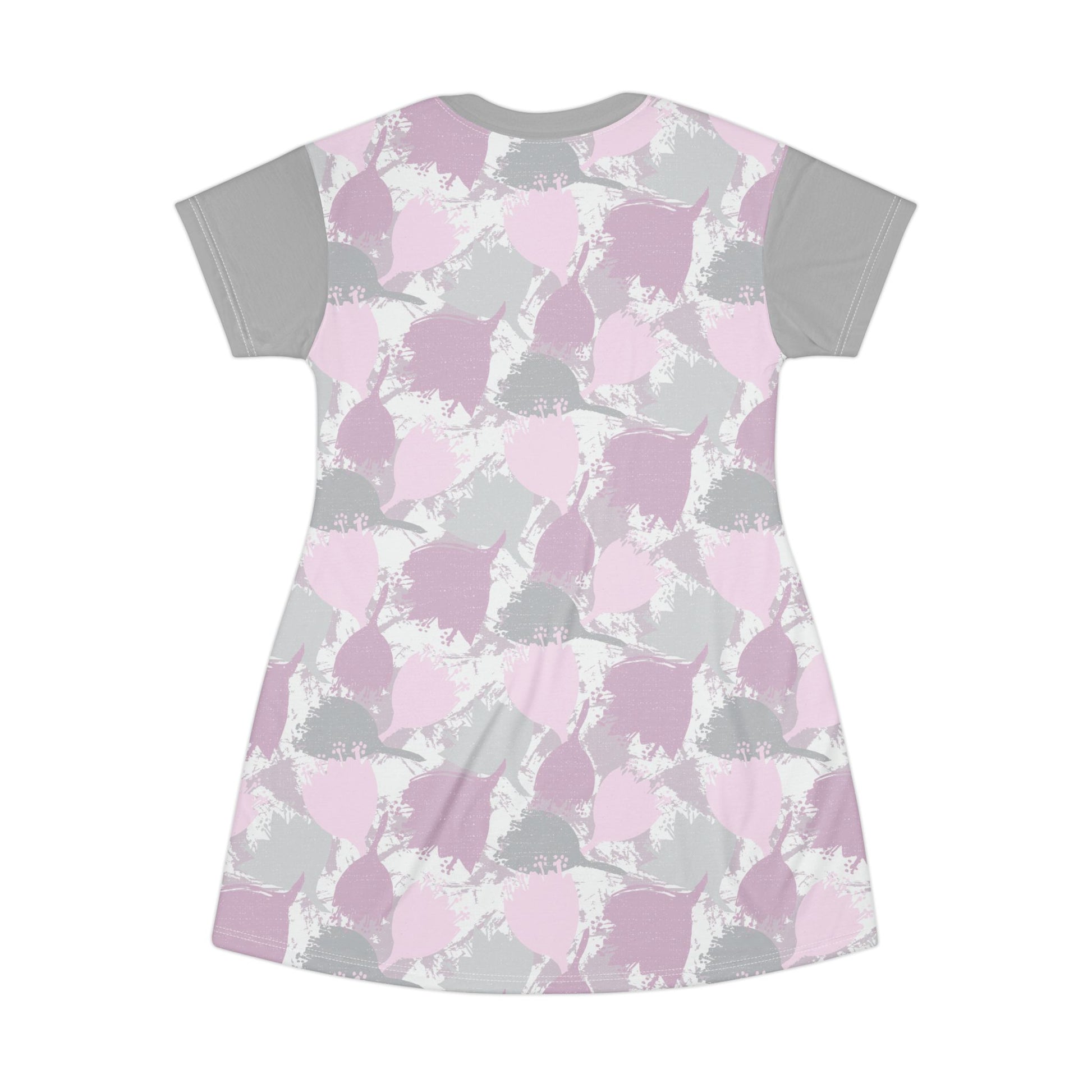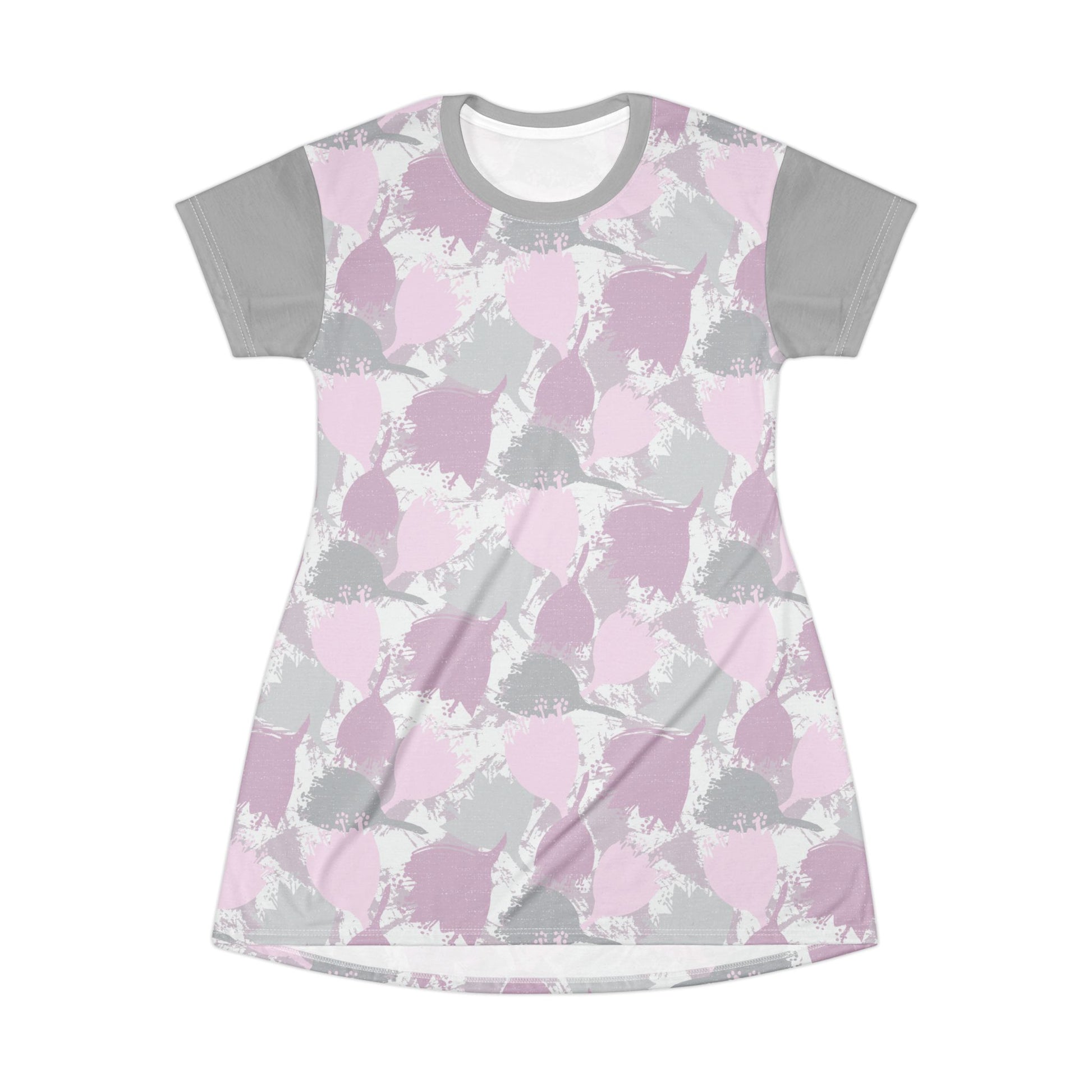 Block Print Style Flowers - T-Shirt Dress, Pink and Grey