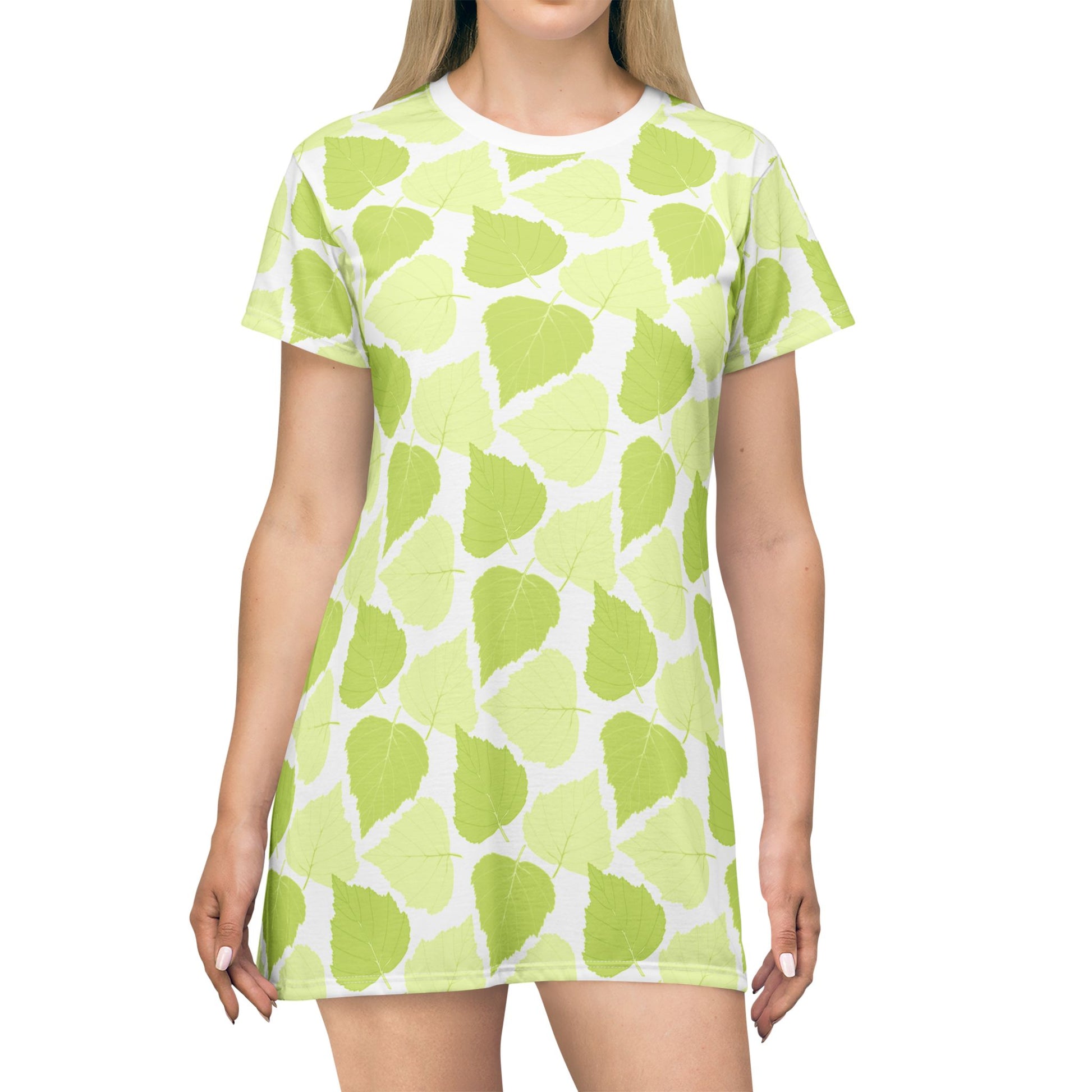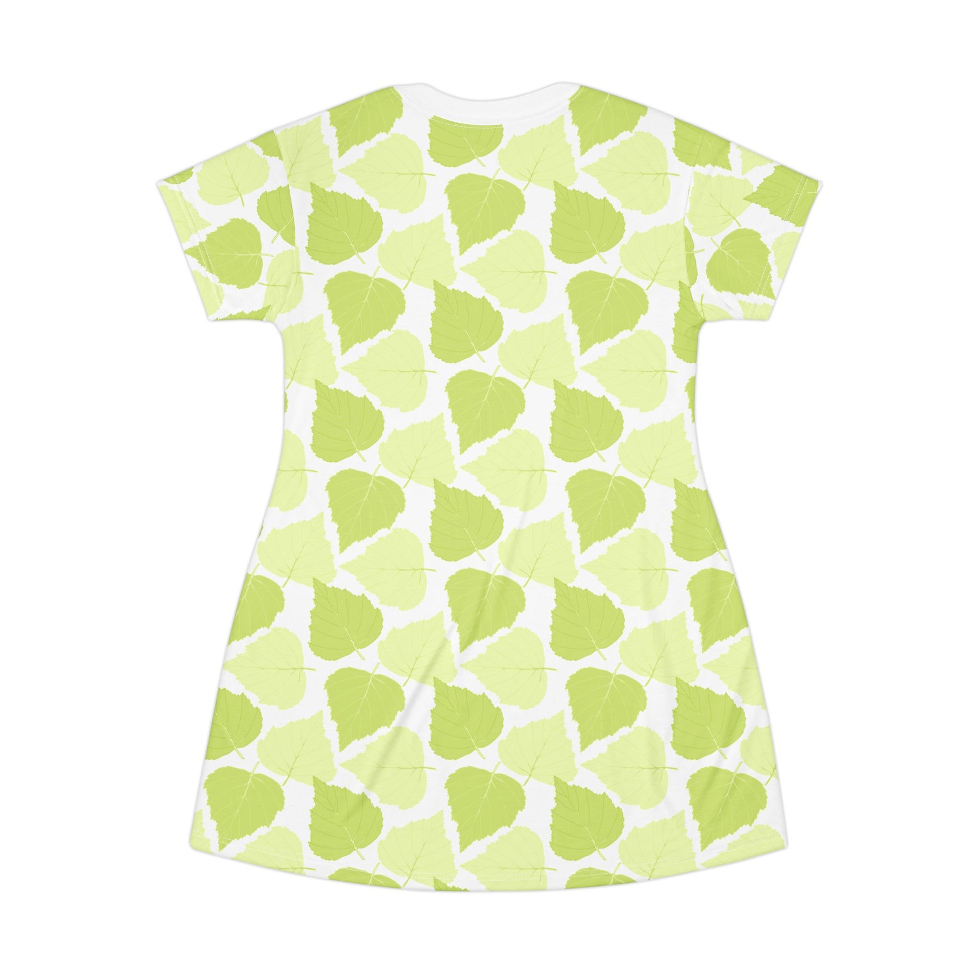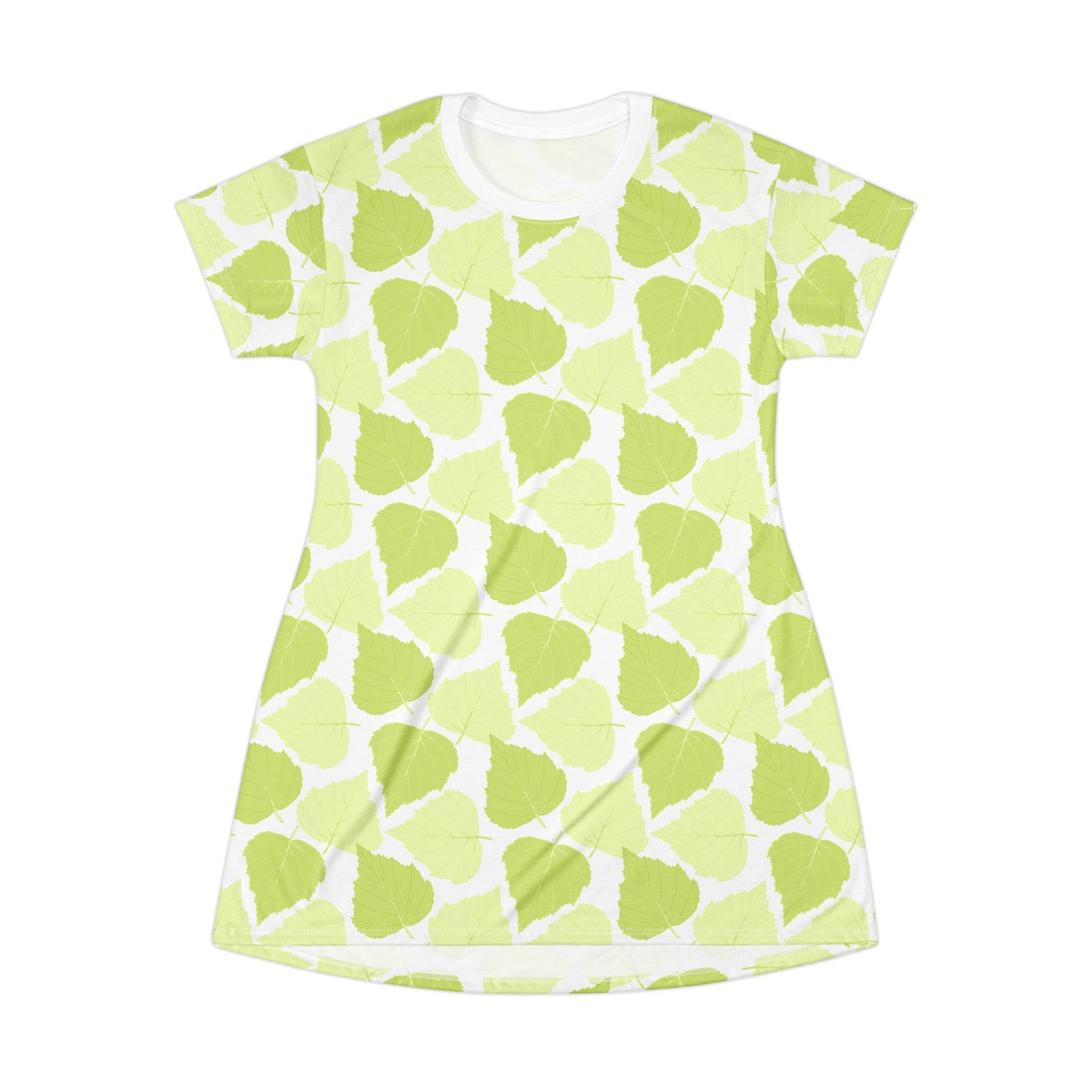 A stylish and comfortable T-Shirt Dress featuring a design of birch leaves. This dress exudes a casual and nature-inspired vibe, perfect for everyday wear or a relaxed day out. Ideal for nature lovers and those who appreciate simple beauty. Suitable for casual outings, picnics, or nature walks.